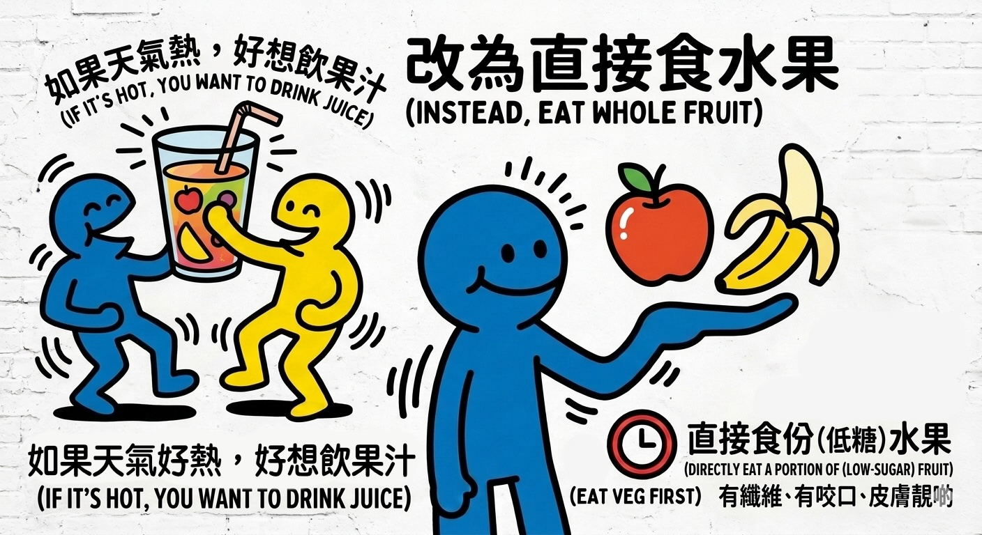 天口㷫,好想飲果汁:盡量唔好飲勁升糖,而且仲要冇咗纖維保護嘅果汁。直接食份 (低糖) 水果,有纖維,又有咬口,又有唔同嘅維他命同埋微量元素。皮膚靚啲,抵抗力都會高啲。