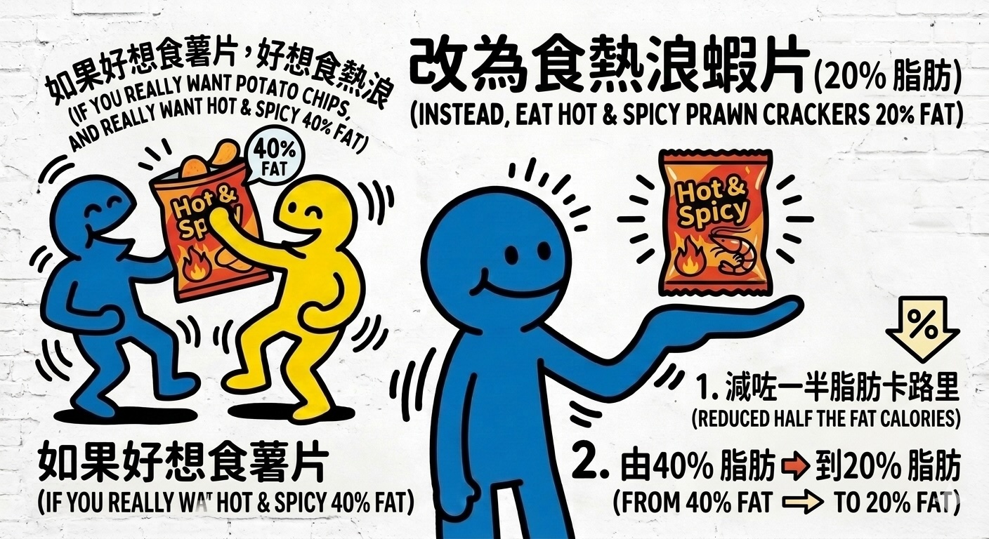 好想食薯片,好想食熱浪:唔食熱浪薯片(脂肪40% )可以考慮熱浪蝦片(脂肪20% ),淨係呢度都慳咗一半由脂肪組成嘅卡路里。
