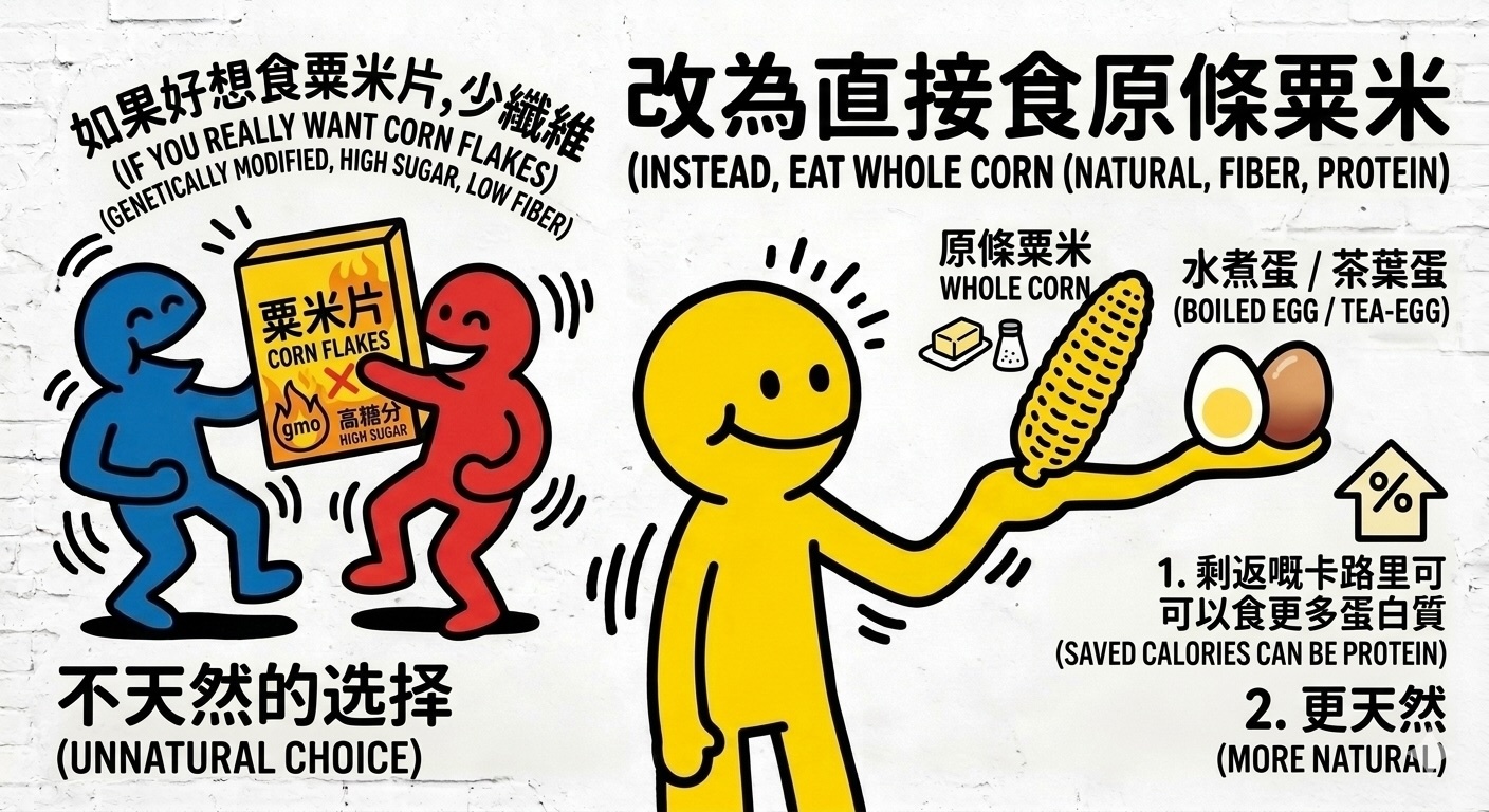 早餐好想食家樂X粟米片(高糖分、通常唔會太多纖維、仲要有唔少嘅脂肪)總之成件事都唔天然,仲係用基因改造嘅粟米:直接食一條粟米(可加鹽、少少硬身靚牛油),剩返嘅卡路里,仲可以食多兩隻水煮蛋或者即食嗰啲茶葉蛋、日式溏心蛋。