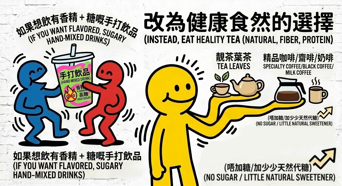 想飲有香精 + 糖嘅手打飲品,改飲靚茶葉茶、精品咖啡、齋啡、奶啡(唔加糖/加少少天然代糖)