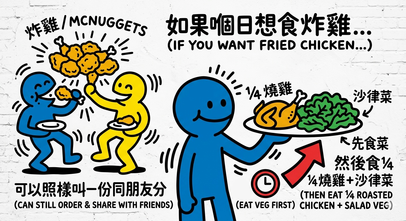 如果嗰日想食麥樂雞或者炸雞,可以照樣叫一份同朋友分,然後食1/4隻燒雞 + 沙律菜(記得食菜先)