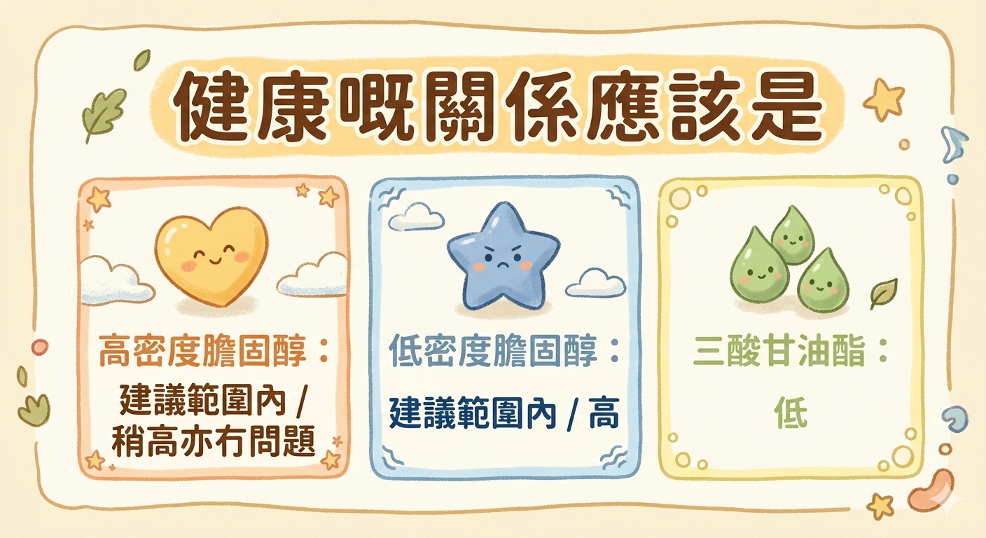 高密度膽固醇:建議範圍內 / 稍高亦冇問題