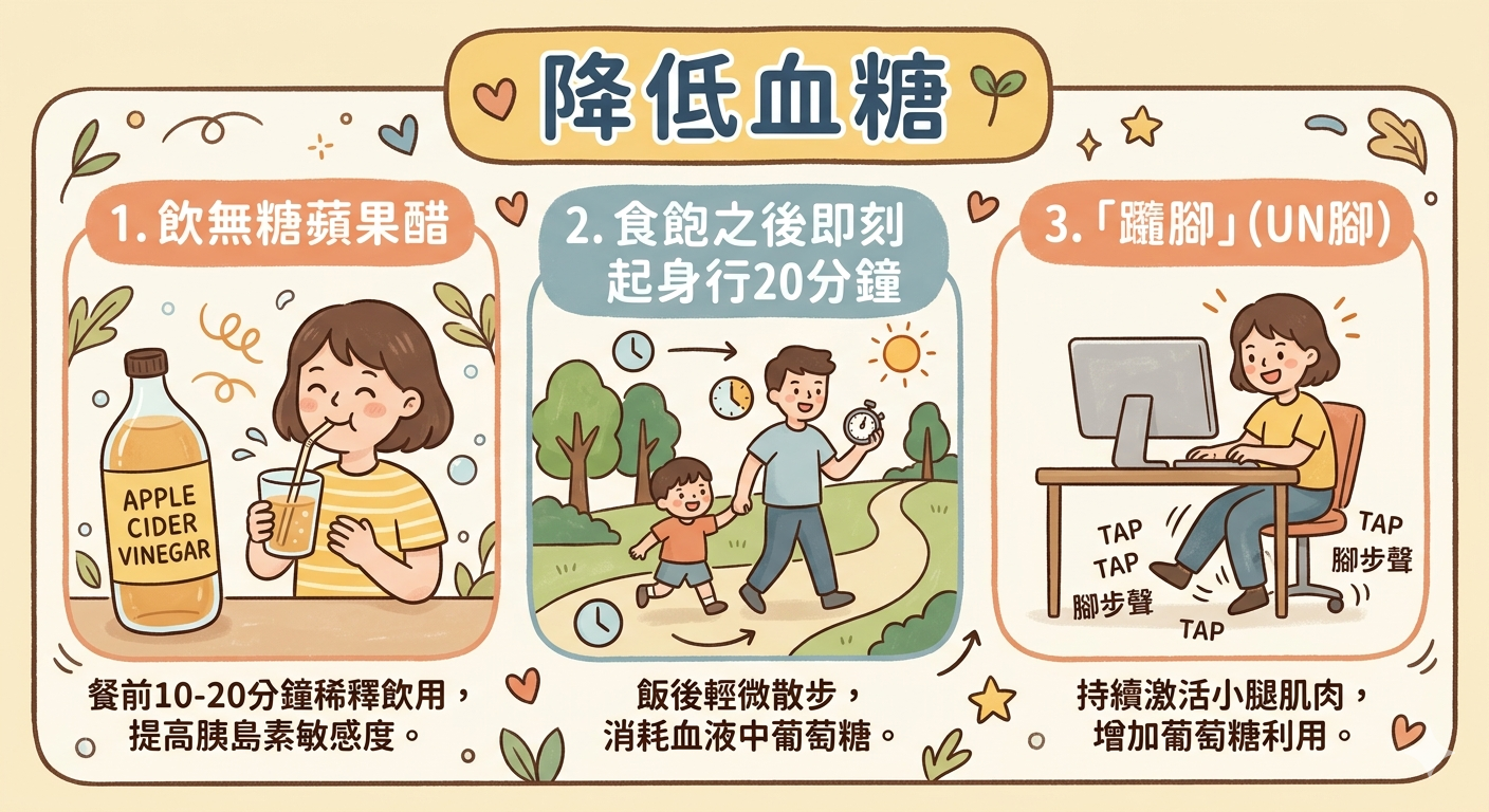 最後最後,爭啲唔記得講,如果想餐後血糖平穩,除咗飲啲無糖蘋果醋,或者食飽之後即刻起身行20分鐘,原來簡單到「䟴腳」(UN腳)都可以降低血糖㗎!!以後食飽記得要周身郁,咁就一定更健康同埋開心!