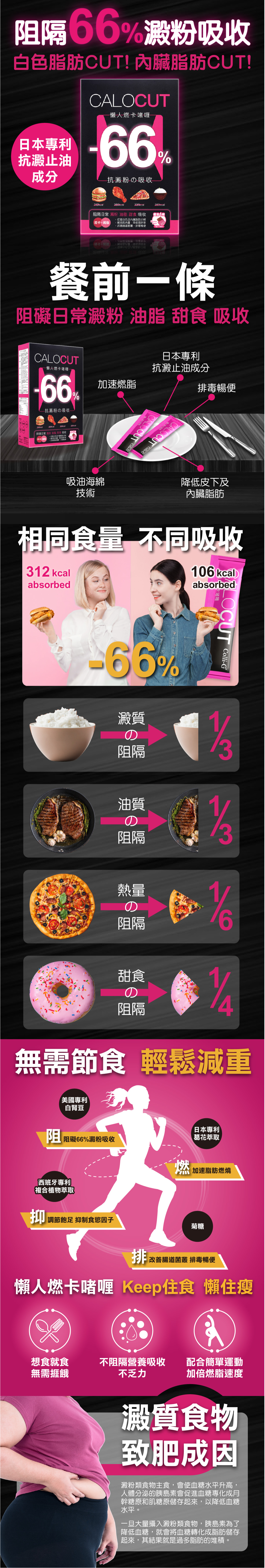 CALOCUT Jelly可控制人體澱粉酶(負責分解人體所攝取的碳水化合物),讓富含澱粉類的大分子不被完全分解、消化、吸收,進而減少合成脂肪的機會,強迫身體燃燒自身脂肪轉化成能量,以達到生酮減重的目的。